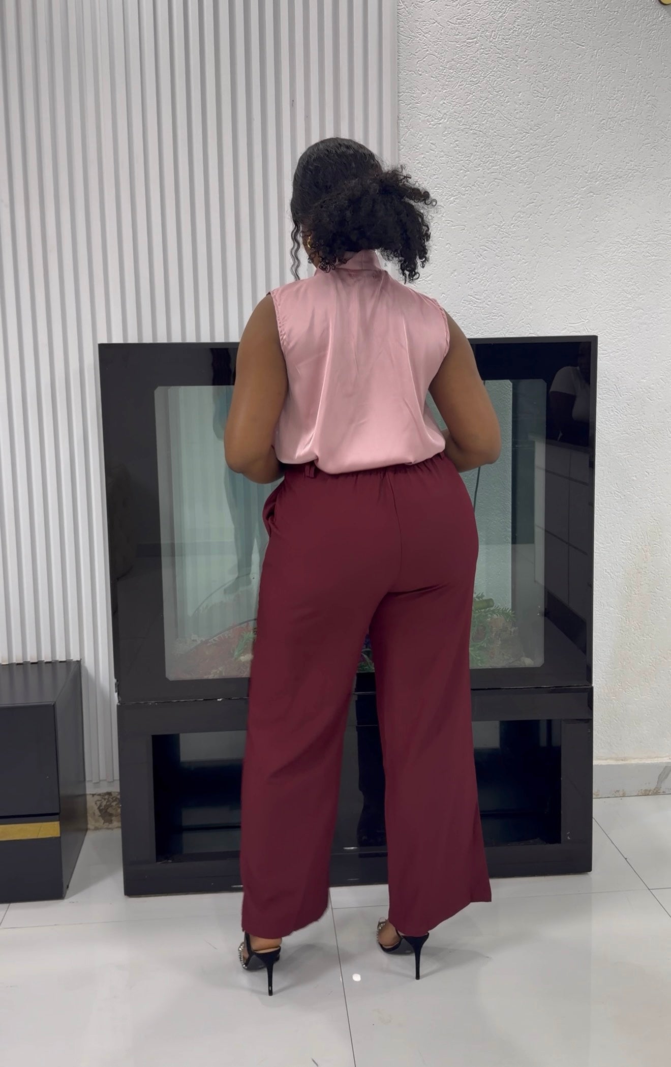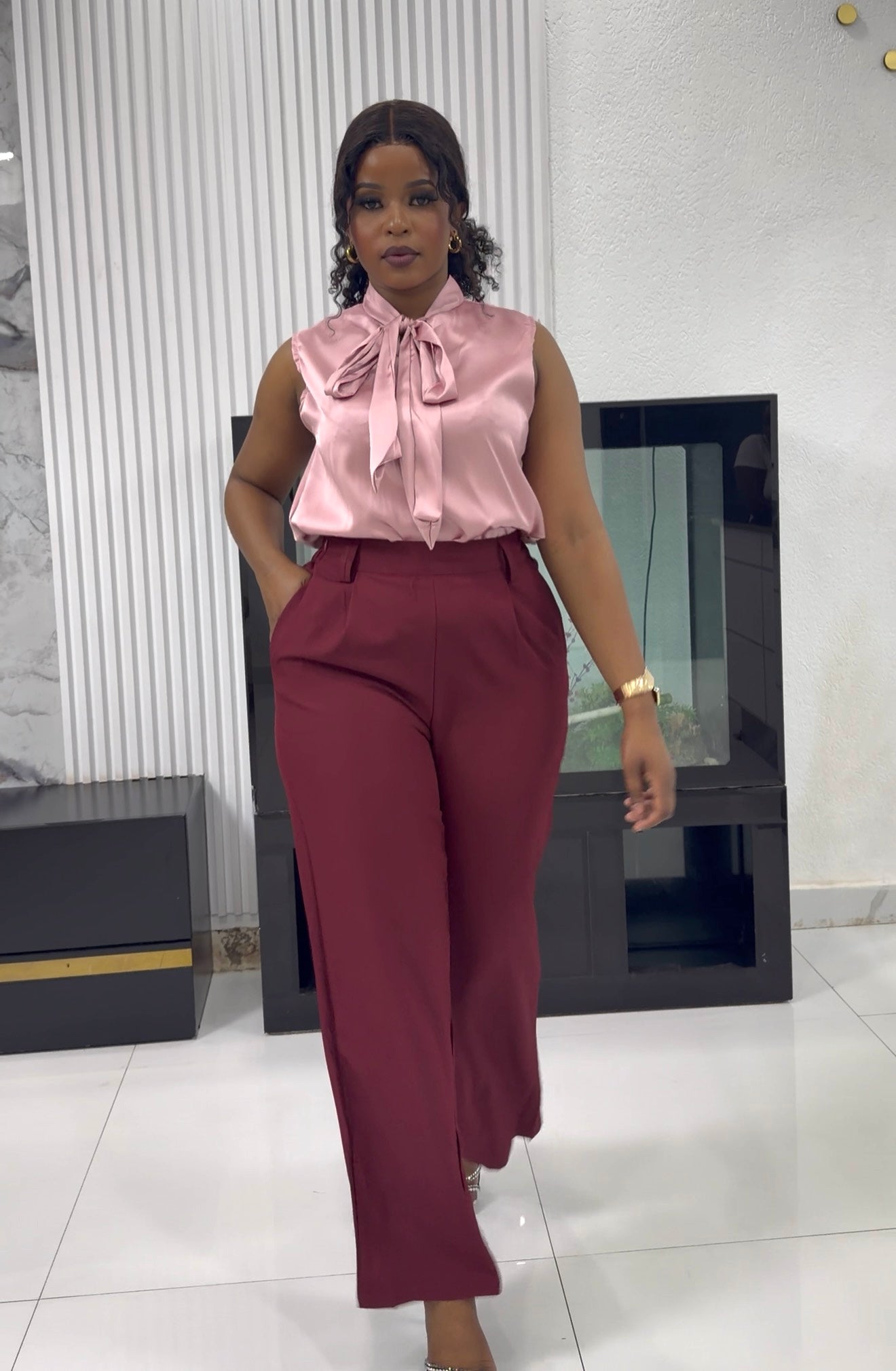 Elevate your power-dressing game with this luxurious two-piece co-ord set. Featuring a silky blush pink pussy-bow sleeveless blouse in premium...