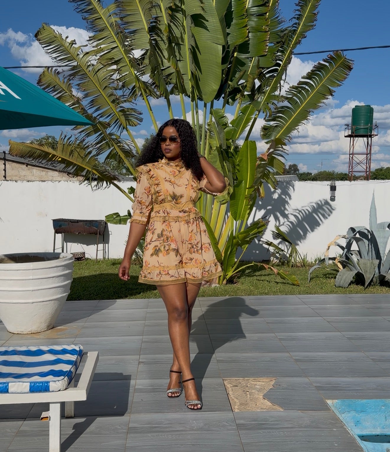 Step into paradise with this dreamy beige floral mini dress. Delicate chiffon layers float over a soft lining, adorned with...