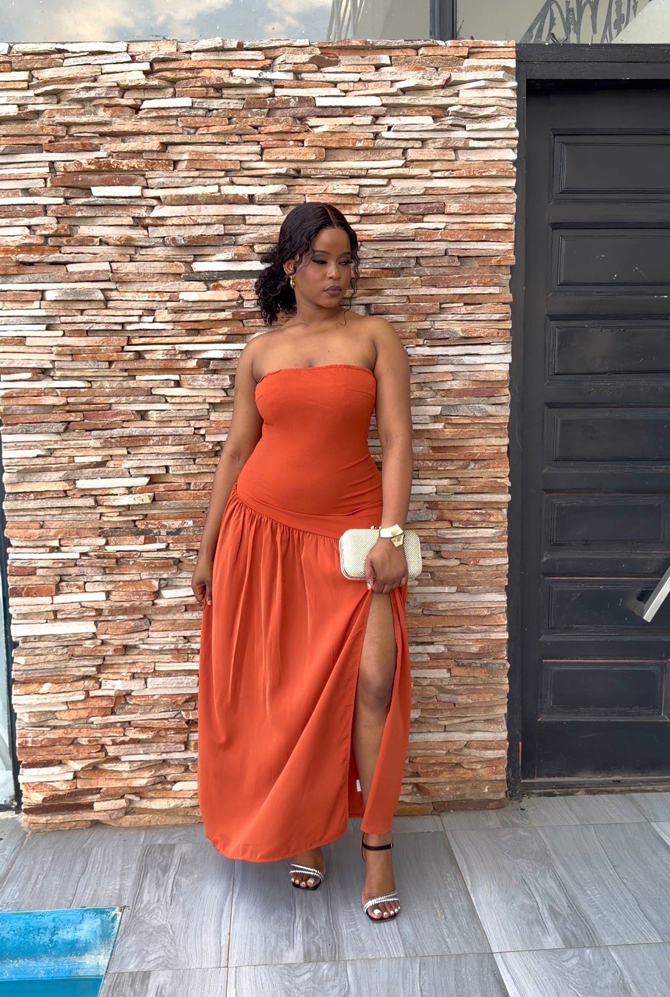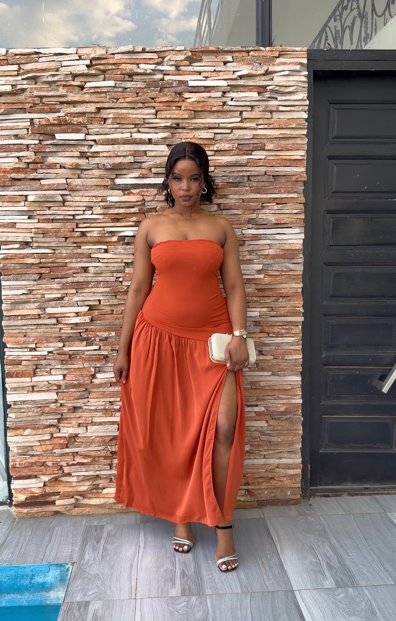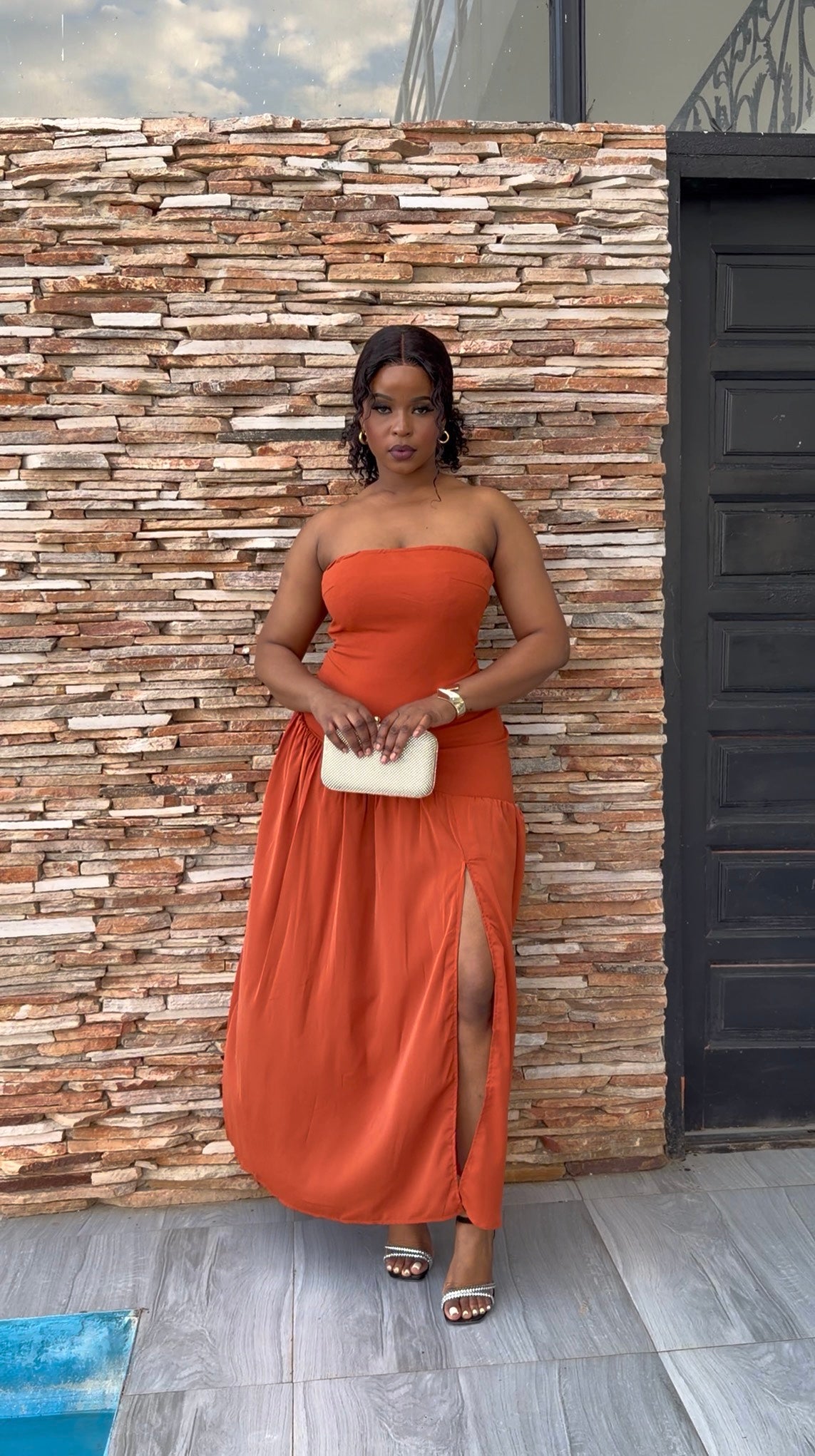 Ignite your wardrobe with this fiery terracotta strapless maxi dress, blending bold burnt orange hues with a sleek tube bodice...